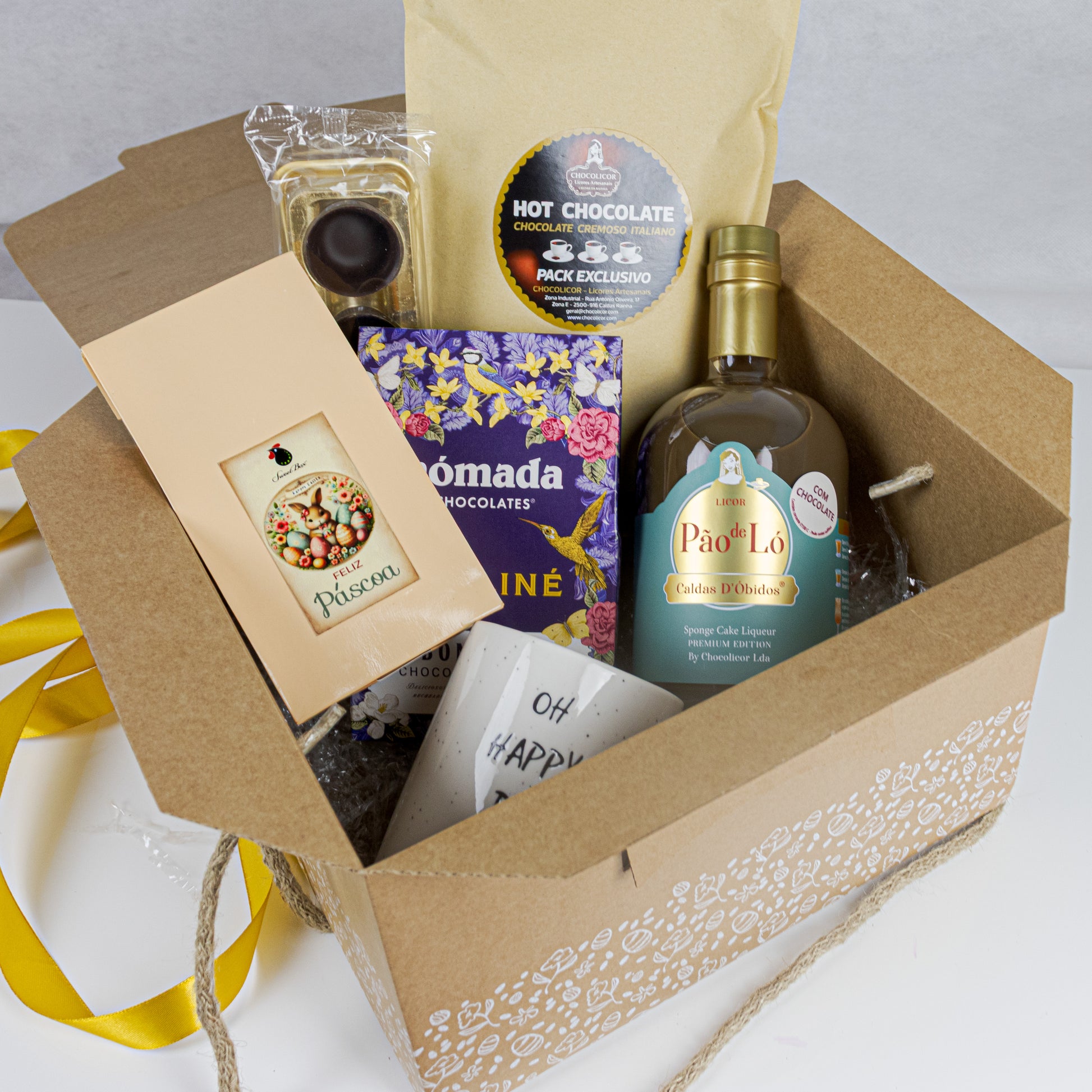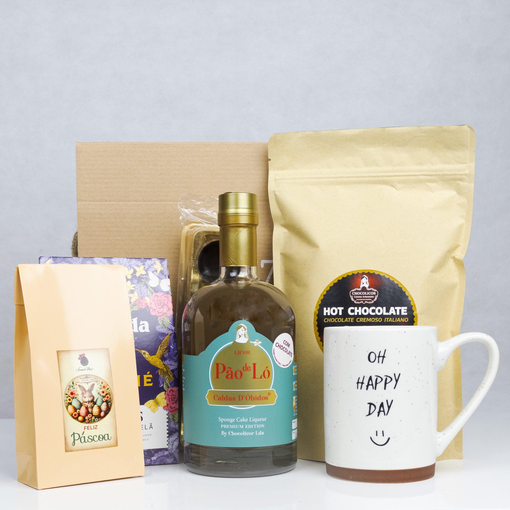 Pack constituído por: 1 licor premium de 500ml ( Licor de Pão de Ló com Chocolate), 1 embalagem de 160 grs de amêndoas italianas com chocolate do Dubai, 1 chávena de cerâmica litgrafada, 1 caixa de bombons com 100 grs, 1 embalagem de 4 copos de chocolate, 1 pack com 3 embalagens para preparação de chocolate quente italiano, acondicionado numa caixa de oferta.