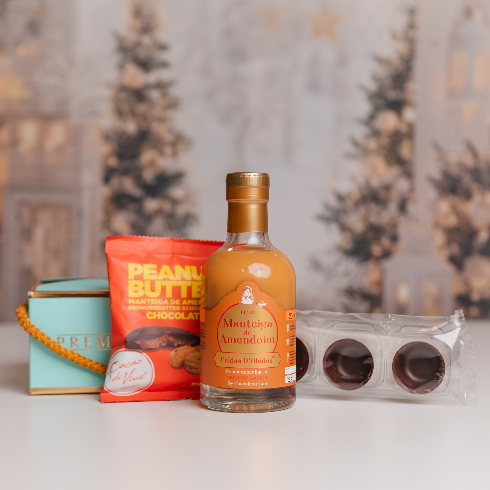 Mini Pack constituído por : 1 licor de Manteiga de Amendoim 200ml, 1 embalagem de chocolates com manteiga de amendoim da Cacao Divine, 1 embalagem com 3 copos de chocolate, acondicionados numa caixa presente.
