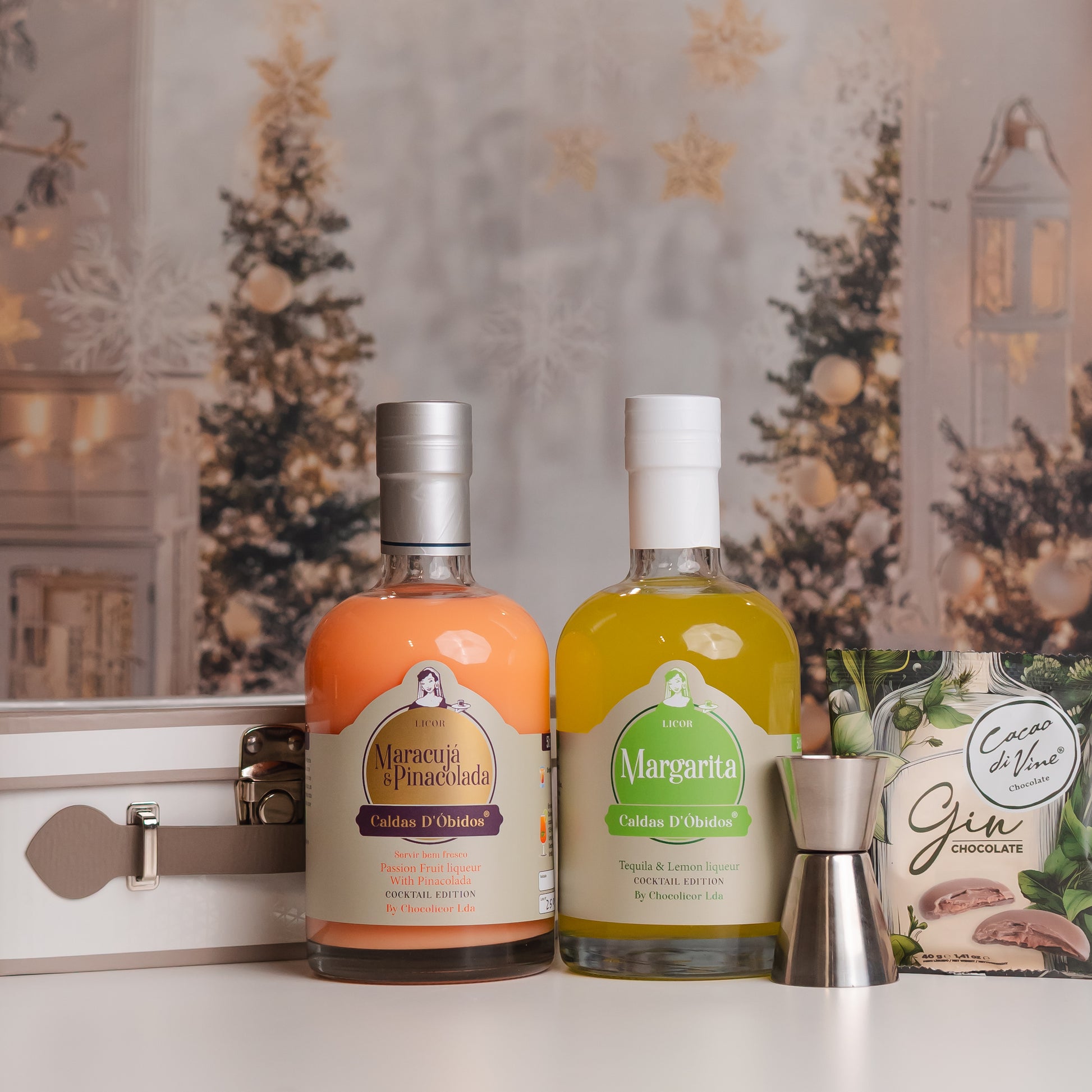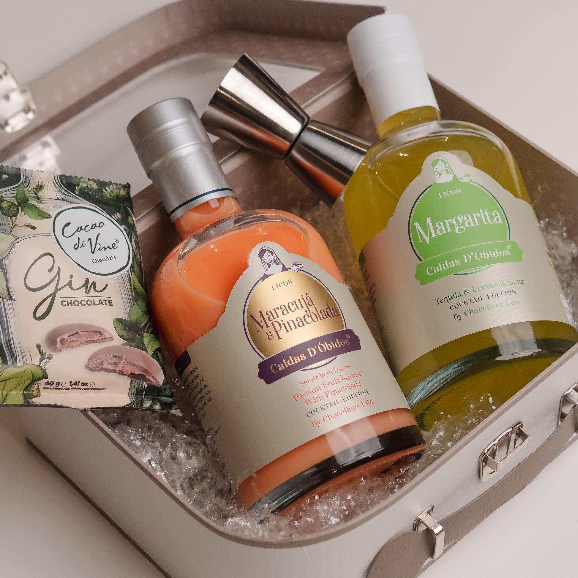 Pack Dupla Cocktails constituído por : 1 licor de Maracujá & Piñacolada 500ml, 1 licor de Margarita 500ml, 1 doseador de inox, 1 embalagem de chocolate com gin da Cacao Divine com 40grs, acondicionados numa caixa presente mala.